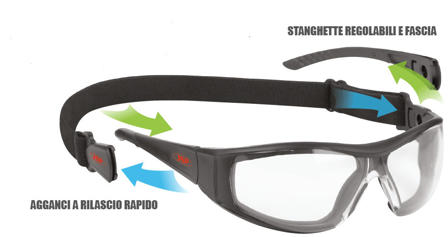 Ogni occhiale è dotato di fascia per la maschera e un set di stanghette per occhiali.