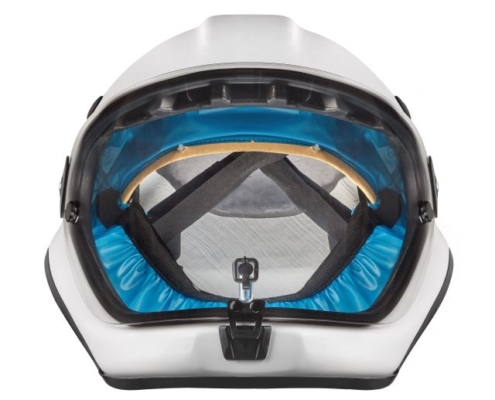 un casco con visiera chiudibile tramite apposito gancio e indicatore di portata integrato.