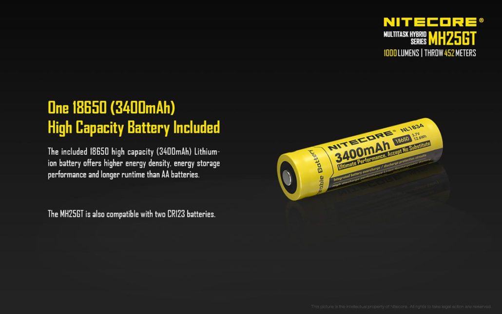 Batterie: inclusa una batteria ricaricabile 18650 3.7V da 3400mAh; può utilizzare anche 2x batterie CR123A usa e getta/ricaricabili da 3.0/3.7V vendute separatamente