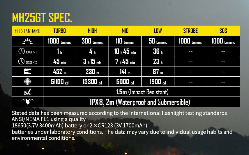 Potenze e Durate: 1000 Lumens (1h) -> 300 Lumens (4h) -> 110 Lumens (10h e 45min.) -> 50 Lumens (36h.) -> Strobo -> SOS